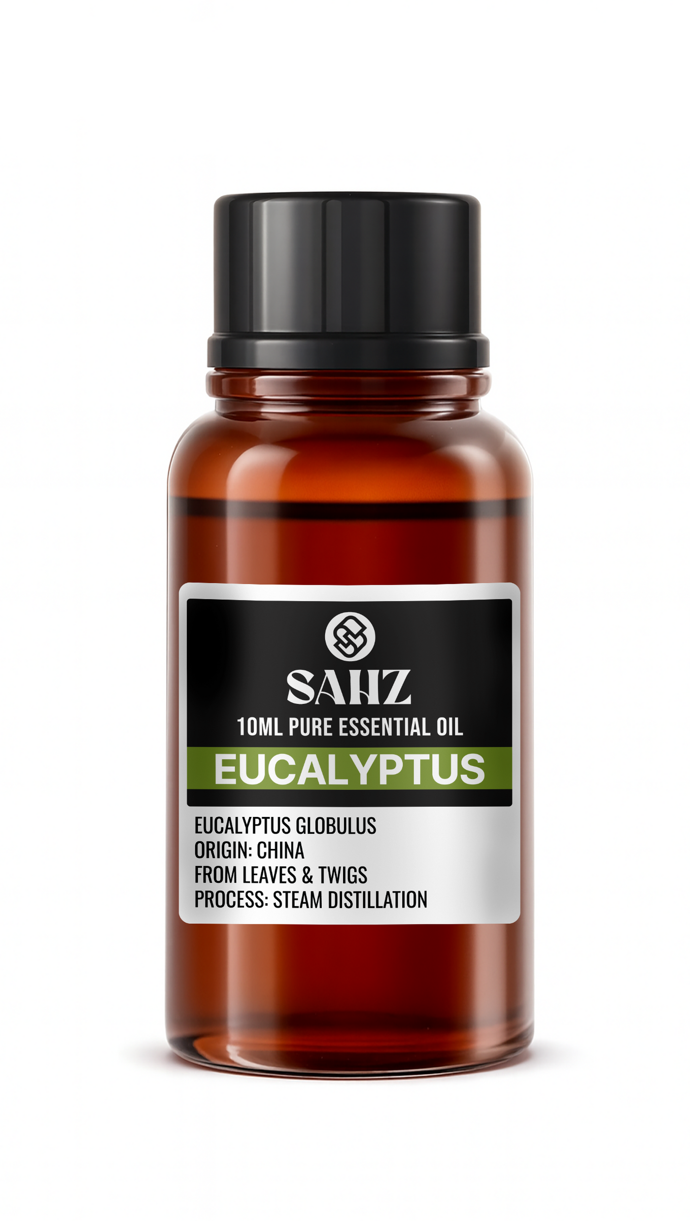 SAHZ Eucalyptus Essential Oil is a pure, refreshing oil known for its cooling aroma and natural cleansing properties. Extracted from the leaves and twigs of the eucalyptus tree, it helps ease coughs, congestion, and muscle tension. In aromatherapy, it promotes clarity, vitality, and energy.